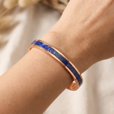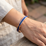 For the free spirited, this timeless half cuff inlay piece comes with your favorite gemstones. Expertly cut and polished pieces of semi precious stones cover the surface of the cuff providing a smooth and sparkling fade which is bound to catch the attention of your peers. This cuff is available in Lapis Lazuli, Idocrase and Himalayan riverstone. Order yours today with three available sizes.