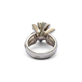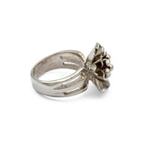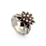 A natural Afghan ruby takes center stage within a delicate silver flower, blending vibrant red hues with floral elegance. Part of the Sunheri Shaam collection, this ring captures the warmth and beauty of a golden evening.”