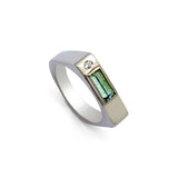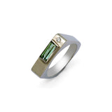 A natural green tourmaline from Afghanistan is set on a sleek straight-line silver band, highlighting the gem’s vibrant hue with modern elegance. Part of the Sunheri Shaam collection, this ring reflects the refined warmth of a golden evening.