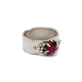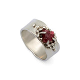 A tribute to nature’s quiet details. This ring features a raw ruby at its centre, surrounded by silver granules that shimmer like morning dew on leaves. Crafted in sterling silver, it celebrates the raw beauty and subtle textures of the natural world, a piece that feels vibrant, delicate, and alive.