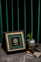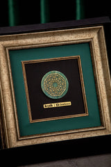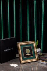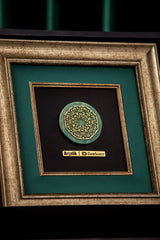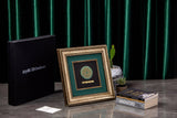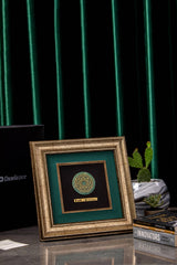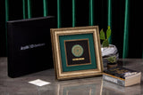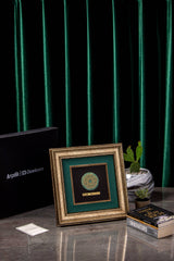 Elevate your corporate gifting with Orah Jewels and Crafts' exquisite framed pieces, a testament to intricate design and superior craftsmanship. Featured here is a stunning wall frame meticulously created for Ar̤elik / Dawlance Pakistan. This elegant piece showcases a central design featuring intricate Islamic geometric patterns, exquisitely rendered and set atop a polished green aventurine gemstone. The natural luster of the aventurine provides a captivating backdrop, enhancing the delicate details of the metalwork.