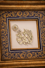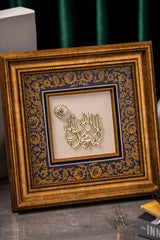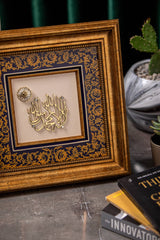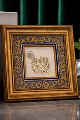 At its heart lies captivating Islamic calligraphy, meticulously crafted and further enhanced by delicate mother-of-pearl inlay. This thoughtful combination of materials and artistic techniques lends the piece a truly unique and luminous aesthetic. It stands as a proud example of a "Made in Pakistan" masterpiece, reflecting the nation's rich heritage of craftsmanship and attention to detail.