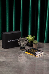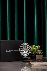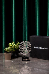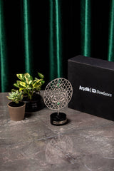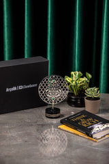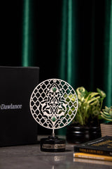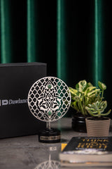 Discover the elegance of custom corporate artistry with Orah Jewels and Crafts. Featured here is a sophisticated piece meticulously designed for Ar̤elik / Dawlance Pakistan. This unique creation showcases an intricate metal disc adorned with beautiful Islamic geometric patterns, a testament to timeless design and precision craftsmanship. Enhancing its allure, vibrant green aventurine gemstones are delicately inlaid within the pattern, adding a touch of natural beauty and color.