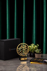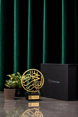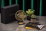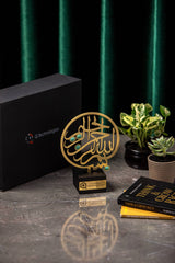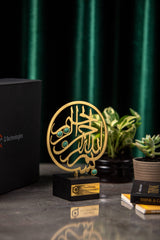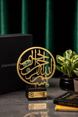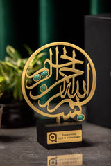 Discover a fusion of artistic design and corporate elegance with Orah Jewels and Crafts' bespoke creations. Pictured here is a magnificent corporate gift meticulously designed for Q Technologies. This striking piece features an intricately crafted metal design showcasing beautiful Islamic calligraphy, which is gracefully inlaid with vibrant aventurine gemstones, adding a touch of natural brilliance and unique character.