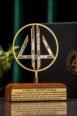 This intricate emblem is elegantly perched atop a rich, polished wooden base, which is further refined by a dedicated metal plate. This plate can be custom-engraved with details such as the unit name, presenter's name, or a significant message, adding a layer of personalization and prestige.