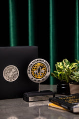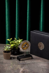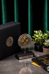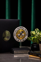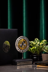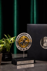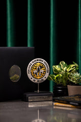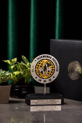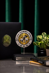 Celebrate achievement and partnership with a distinguished corporate award from Orah Jewels and Crafts. Pictured here is a unique and prestigious piece meticulously crafted for the Pakistan Taekwondo Federation. This award beautifully depicts the federation's official logo, rendered in polished metal to a brilliant diamond finish, ensuring a striking visual impact. The emblem is elegantly presented atop a sleek, black wooden base.