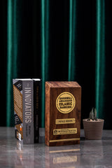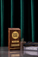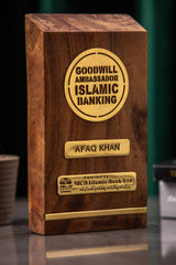 Crafted from richly grained natural wood, this custom-made plaque features precisely cut brass inlays that display the title “Goodwill Ambassador – Islamic Banking”, along with the recipient’s name and the bank’s logo.