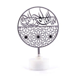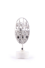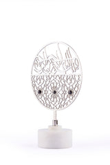 Unique Islamic geometric patterns, Bismillah calligraphy and natural gemstone Jasper inlaid within the patterns giving it a rich and classic look. Standing on a white marble base this piece will be an eye catching addition to your home décor.
