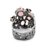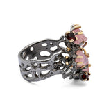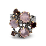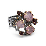 Handcrafted in silver, the Meher Ring features two raw rose quartz stones paired with faceted garnets sourced from Hunza Valley. The contrasting textures and hues are thoughtfully set to highlight the natural beauty of each gemstone. Meticulously crafted by skilled artisans, this ring celebrates heritage-inspired design and timeless craftsmanship, reflecting the refined artistry of Shigar Fort.