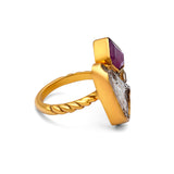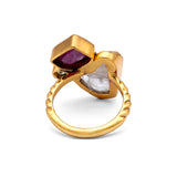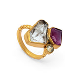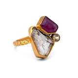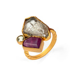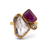 A vibrant trio of colours inspired by the wild landscapes of the north. This handcrafted ring features a 4.25 carat Afghan ruby with a deep blood-red hue, paired with raw aquamarine and a sparkling faceted topaz, each stone celebrating its own unique character. Set in sterling silver with 24k gold plating, it’s a piece that feels organic, expressive, and full of joyful energy.