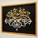 Handcrafted with care and adorned with the soft radiance of milky quartz, this frame features the sacred verse “يُدْخِلُ مَن يَشَاءُ فِي رَحْمَتِهِ”. The graceful calligraphy and gentle gemstone tones reflect tranquility and compassion, making it a meaningful addition to any serene space.
