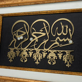 Orah Jewels presents a masterpiece of craftsmanship and spirituality, an intricately designed wall frame adorned with meticulously hand-cut and polished natural gemstones. At its heart, the sacred inscription "بِسْمِ ٱللَّهِ ٱلرَّحْمَٰنِ ٱلرَّحِيمِ" (Bismillahi Al-Rahman Al-Raheem) is elegantly displayed. This revered phrase, meaning "In the name of Allah, the Most Gracious, the Most Merciful," is a powerful invocation that signifies divine blessings, mercy, and guidance, making it a meaningful addition to any space.