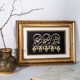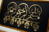 The frame is crafted from Milky Quartz, a gemstone known for its soft translucence and calming aura. This stone has long been associated with purity, clarity, and spiritual awakening, believed to bring peace and positive energy into its surroundings. The gentle white tones of the milky quartz beautifully contrast with the intricate golden calligraphy, enhancing its visual and spiritual impact.