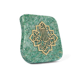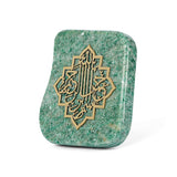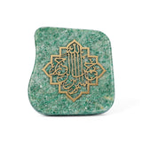 Carved into natural aventurine and finished with refined brass calligraphy, this piece carries both spiritual weight and quiet beauty. Aventurine, sourced from the highlands of Pakistan, brings a calming, grounding energy that makes this piece as restorative as the words it holds. Its rich green hues and natural stone texture make every piece subtly unique.
