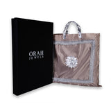 Each gift is presented in an exquisite organza bag featuring silver-coloured gotta. The gift box is also wrapped with a lilac ribbon and decorated with delicate fabric flowers for a complete, elegant presentation.